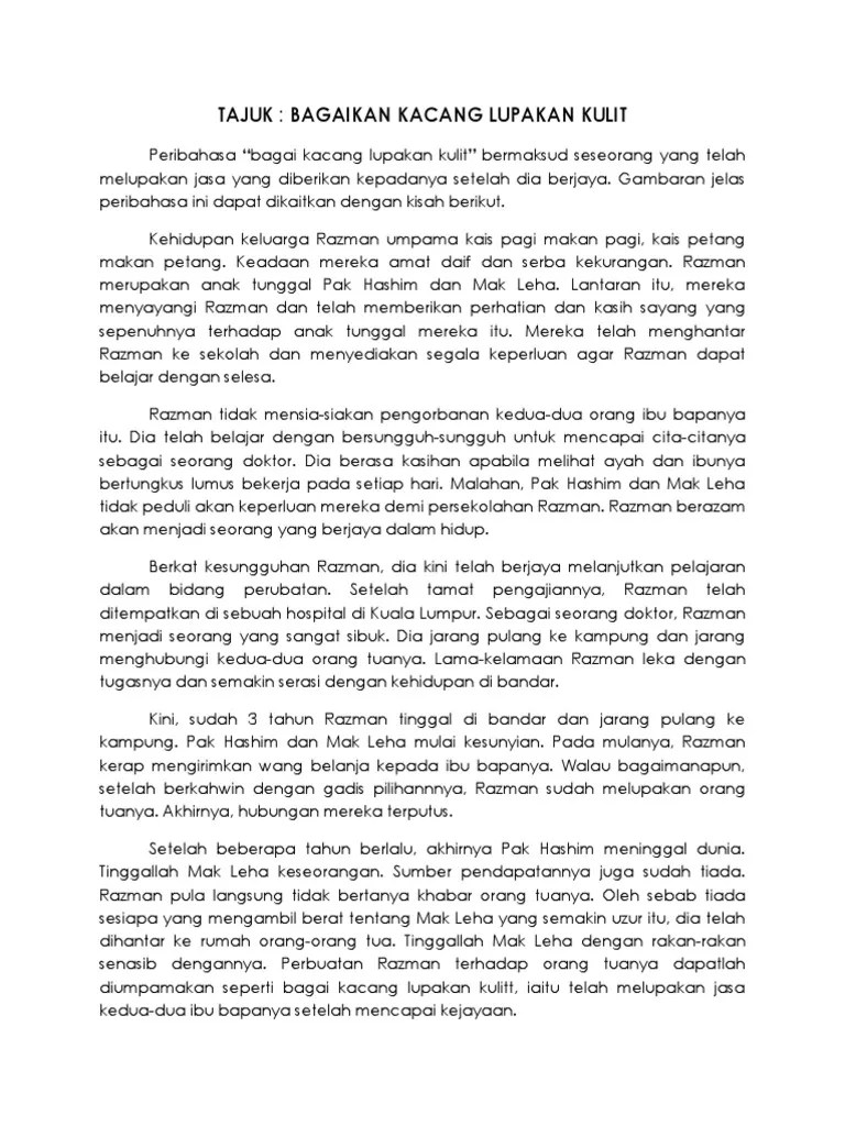 "seperti kacang lupakan kulit" refers to someone who is being ungrateful. 1) orang yang dahulunya miskin setelah menjadi . Terutama seseorang yang berasal dari desa dan pergi ke kota, menjadi kaya atau . Dia sering memburukkan rosni, sedangkan rosni . "bagai kacang lupa kulitnya" adalah suatu peribahasa, yang dalam kamus peribahasa berarti: Bagai kacang lupa akan kulitnya: